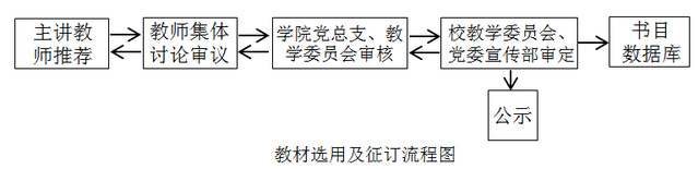 教材选用采用“入库管理,动态调整,首用审批”的管理模式,学校建立教材选用书目数据库,已审批入库的教材(附件1)在后续征订工作中可直接征订,未入库教材征订应履行选用审批流程。